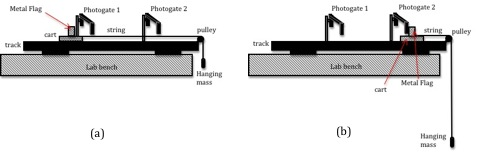 Place the photogates sufficiently far apart. Make sure the cart's flag is before the first gate when the hanger is all the way up near the pulley as shown in Fig. 3a. Also, make sure the cart's flag passes the second photogate before the hanger hits the ground. See Fig. 3b. This will ensure that the cart is being accelerated in the region between the two photogates.