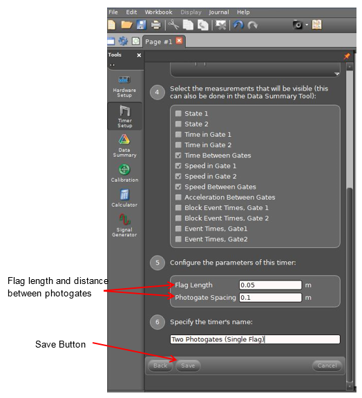 You must input the value of the flag length and the spacing between photogates, as shown in Fig. 6. Remember to click on the Save button.